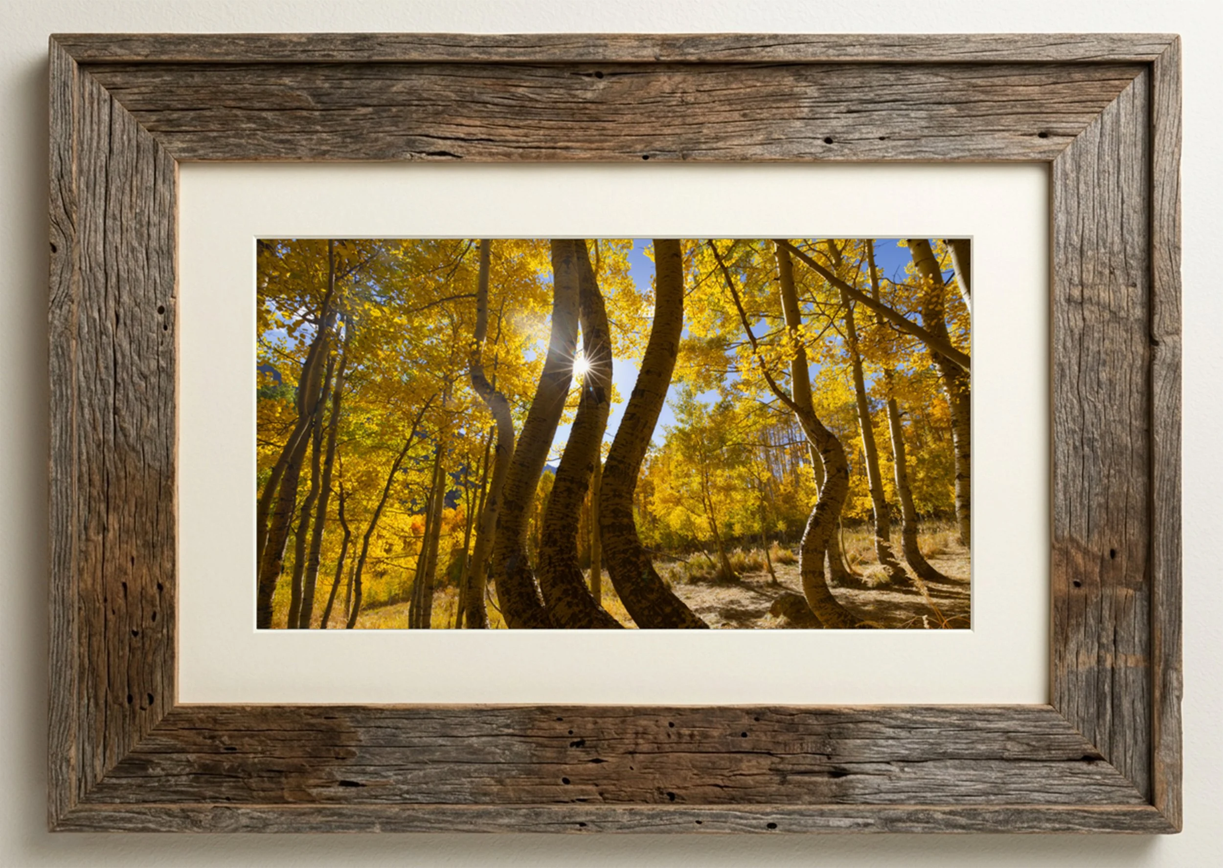 They weren't just standing; they seemed to sway in a choreographed movement, their white trunks curving and twisting in ways that felt almost lyrical. The light was filtering through the high canopy above, casting a soft, dappled glow that felt like it belonged in a cathedral. Through the breaks in the gold leaves, the jagged silhouettes of distant mountains rose up, silently guarding the valley.